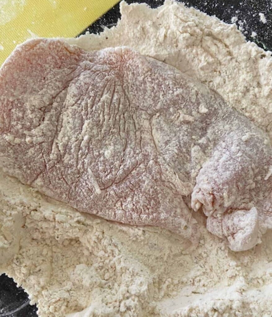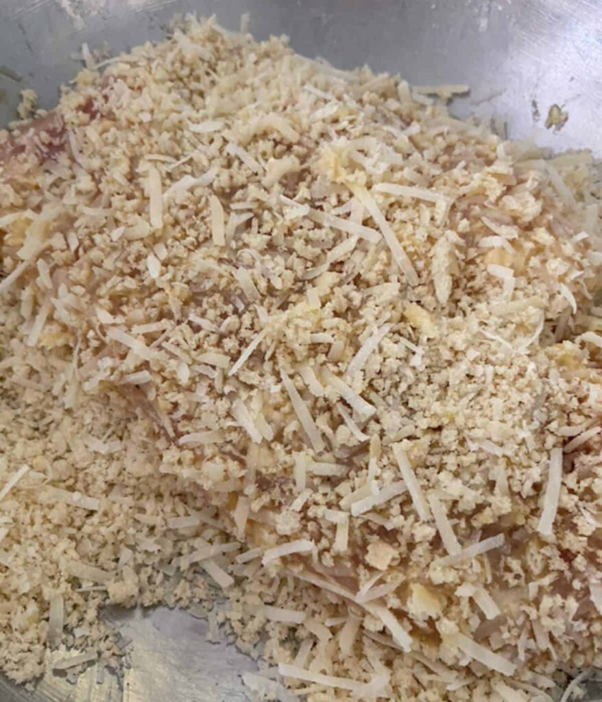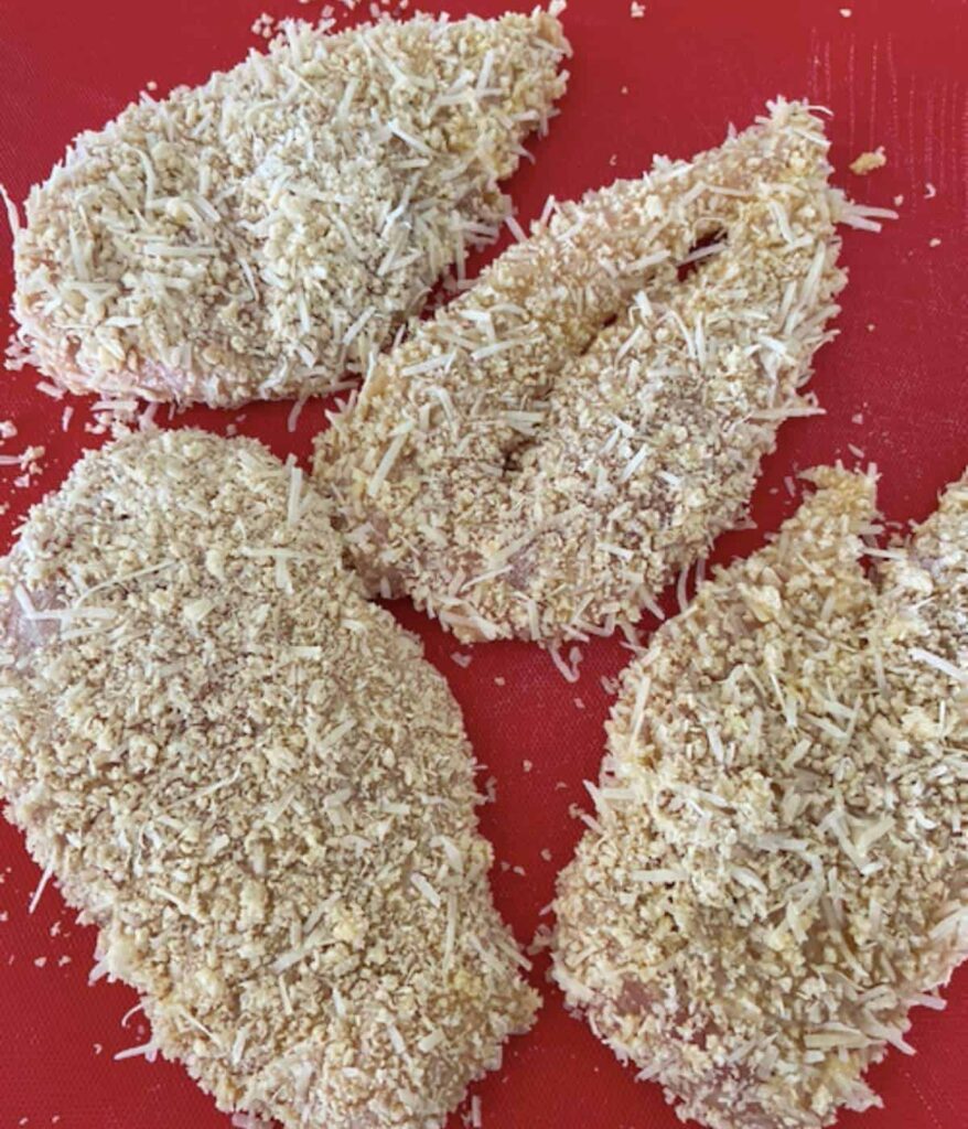 Dredge each chicken piece in flour, then dip into the egg mixture, and finally press into the breadcrumb and cheese mixture. Make sure the coating sticks well to create a full, even crust.