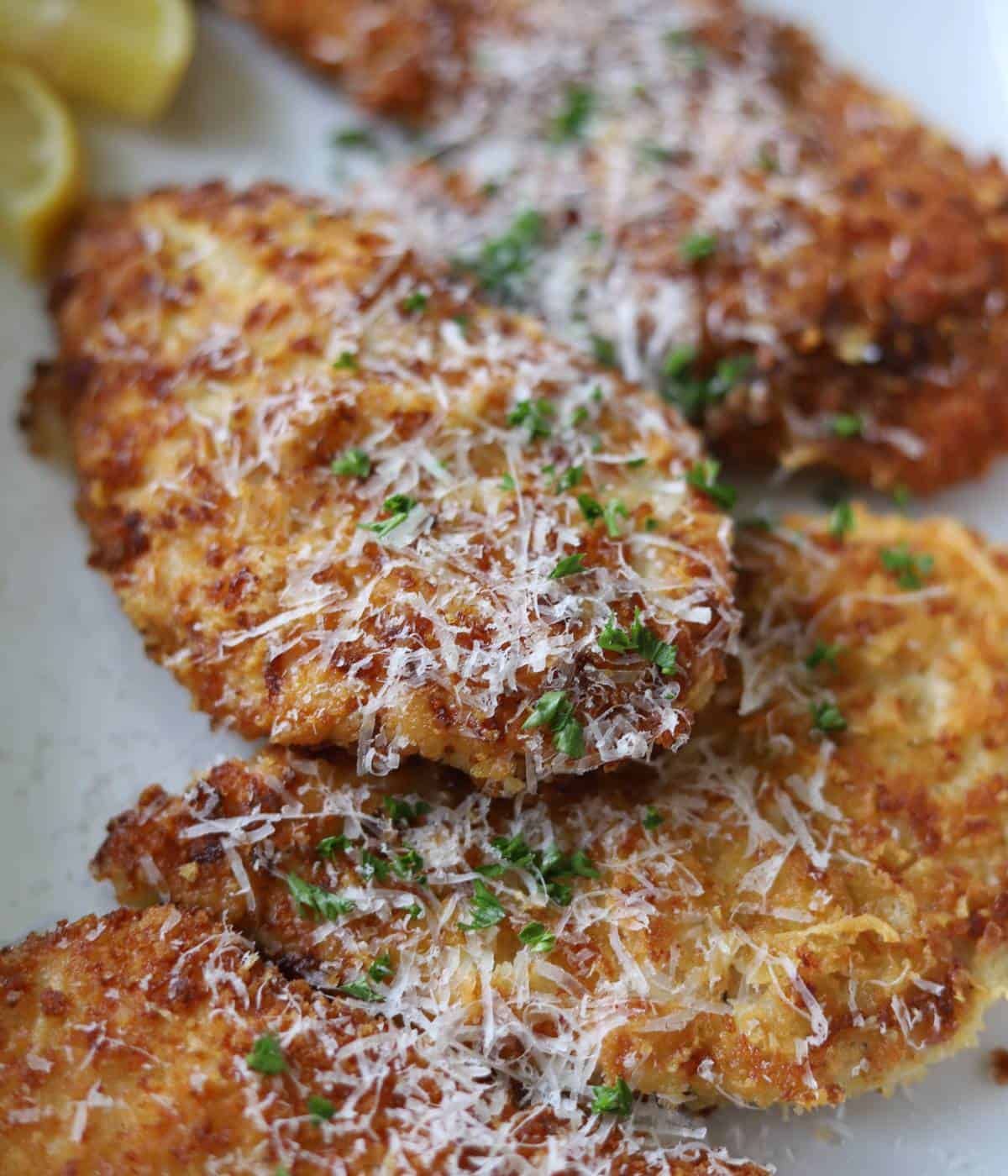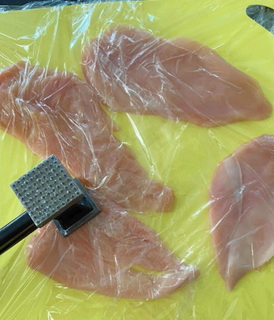 Slice the chicken into thin, even cutlets and pat them dry. Set up three bowls with flour, beaten eggs mixed with milk, and breadcrumbs combined with Romano cheese and seasonings for easy coating.