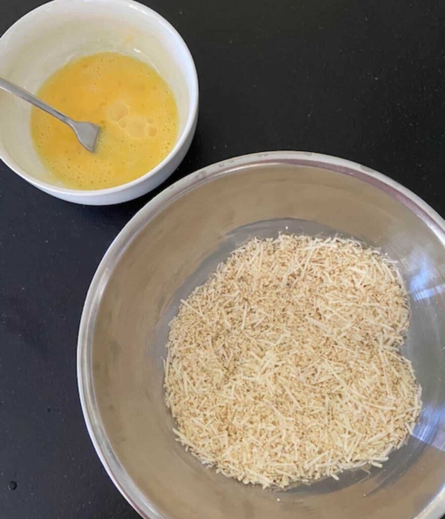 - Prepare flour, egg mixture, and breadcrumb mixture.