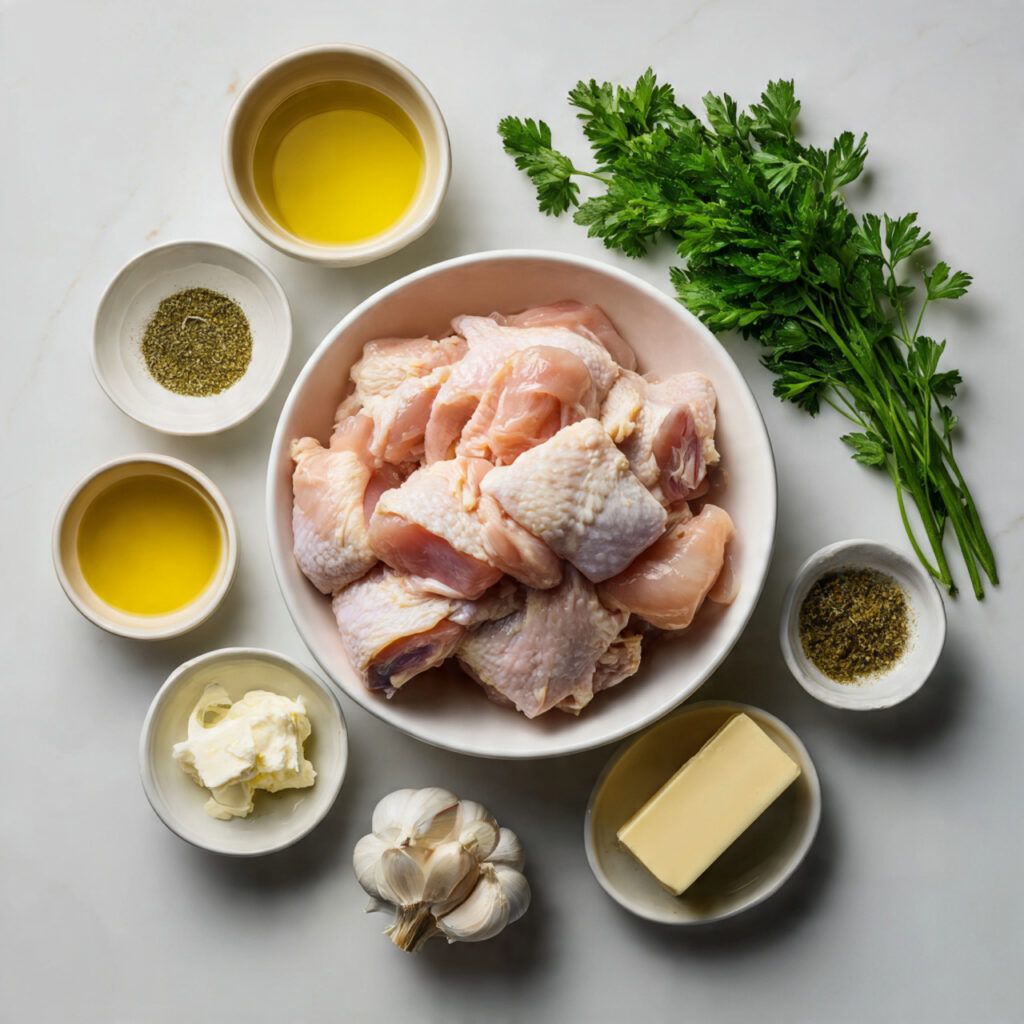 Place the chicken pieces in a bowl and season with salt, pepper, paprika, and garlic powder. Toss well so each piece is evenly coated. Set everything aside while preparing the skillet and gathering the remaining ingredients.