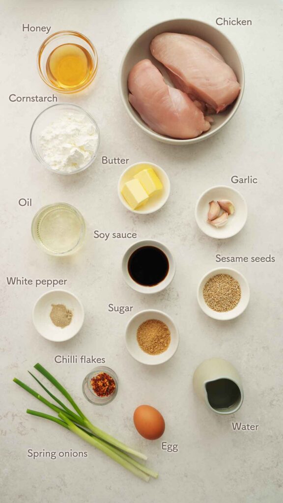 • Melt butter in a pan. Add garlic and cook until fragrant. Add honey, soy sauce, sugar, sesame oil, slurry, and chilli. Stir until thick.
