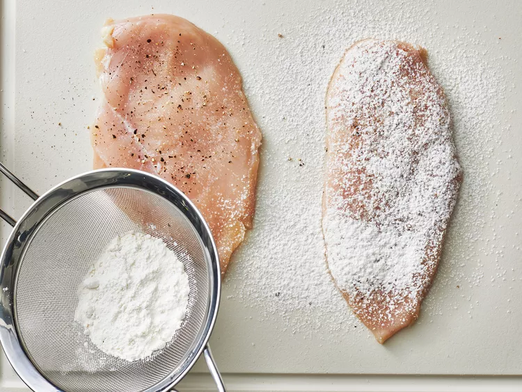 - Coat chicken in flour, dip in eggs, then cover with breadcrumbs.