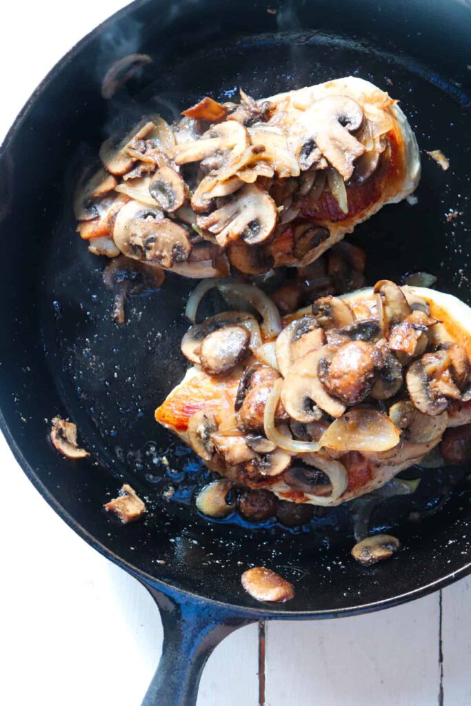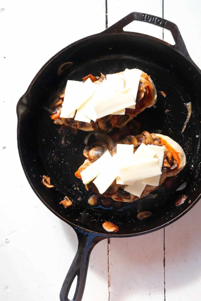 Return the cooked chicken to the pan and spoon the onion and mushroom mixture over each piece. Sprinkle both cheeses on top, cover the pan, and let it sit until the cheese melts and becomes soft and slightly bubbly.